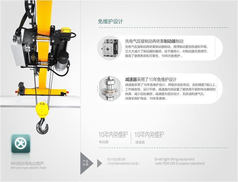 節(jié)能環(huán) 保等優(yōu)勢。電動葫蘆應(yīng)用8項專利技術(shù),零部件采用模塊化制造工藝,通用性強(qiáng),免維護(hù)率高,易損件少。