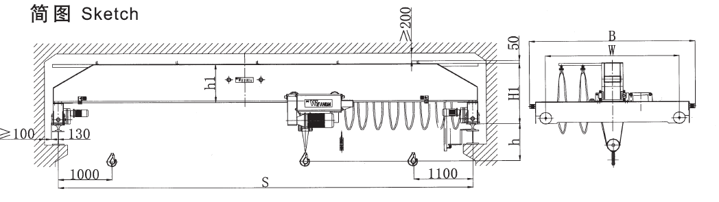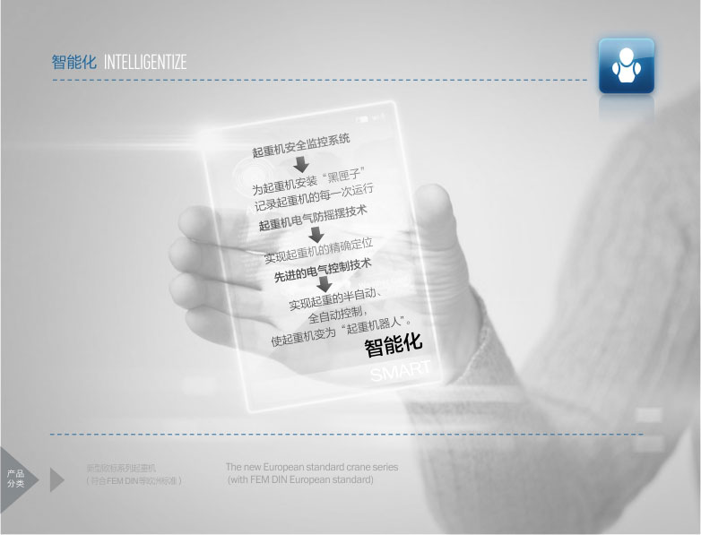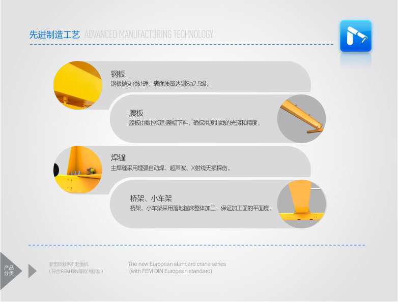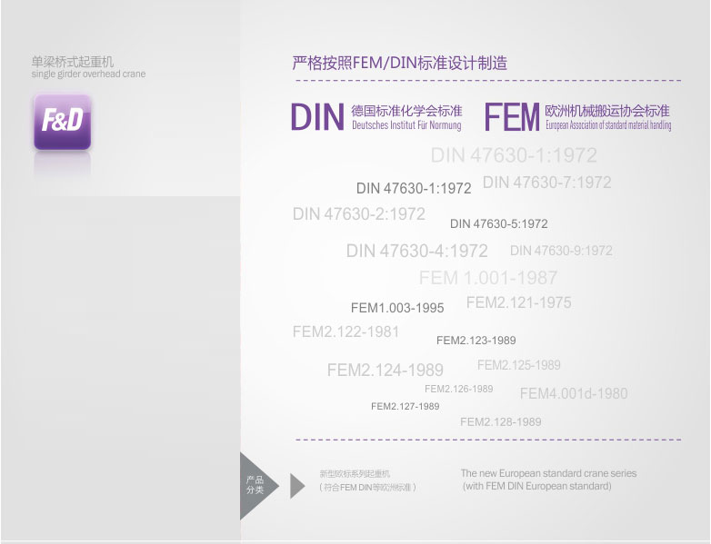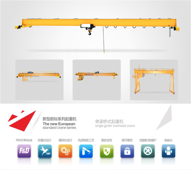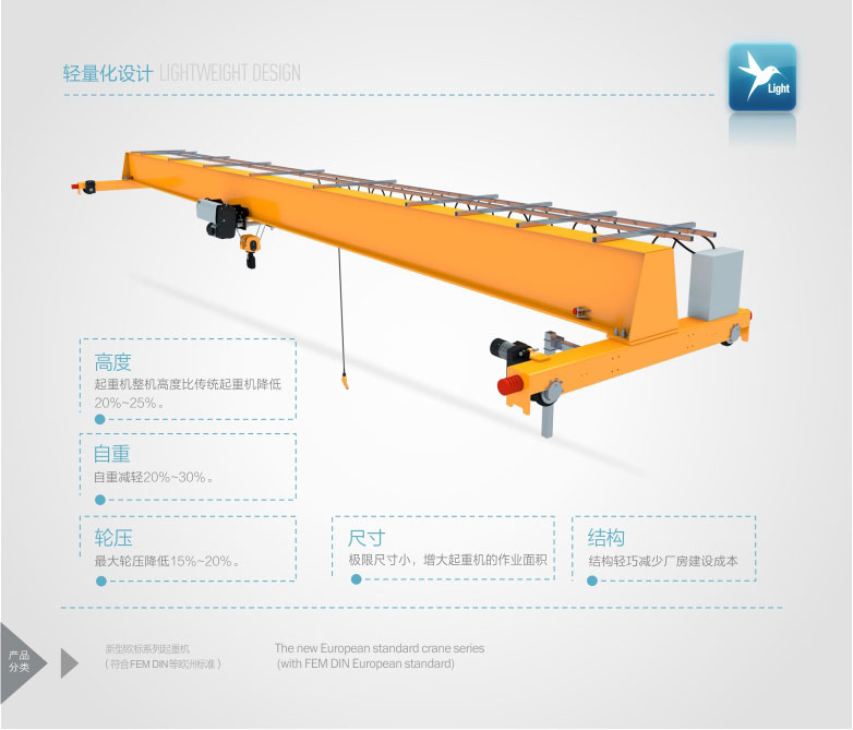 2、 該產(chǎn)品技術先進,設計按照國際標準:DIN(德國)、FEM(歐洲)、ISO(國際),具有剛性強、自重輕、結構設計出眾等優(yōu)點,能有效地節(jié)約廠房空間和投資成本,行走結構特點獨特。