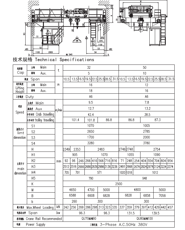 二、產(chǎn)品簡圖及技術規(guī)格(QC32/5-50/10t)