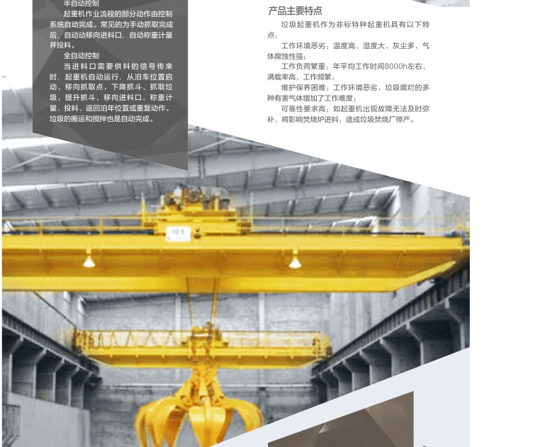 1、 垃圾抓斗起重機是現(xiàn)代城市各種垃圾焚燒發(fā)電廠垃圾供料系統(tǒng)的核心設備,位于垃圾儲存坑的上方,主要承擔對垃圾的投料、搬運、攪拌、取物和稱重等作業(yè)。